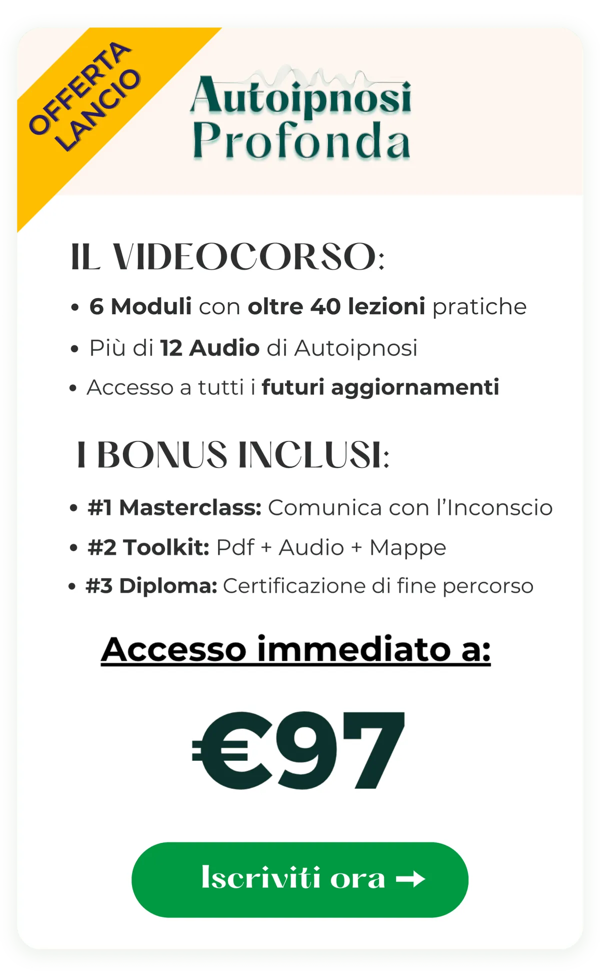 Assolutamente sì. L'autoipnosi è uno stato naturale della mente e il videocorso è costruito per guidarti passo dopo passo, in totale sicurezza. Ogni esercizio è spiegato con chiarezza e puoi praticarlo al tuo ritmo, nel tuo spazio. Sei sempre cosciente, lucido, in controllo e imparerai anche a creare un "Luogo Sicuro" da usare in ogni sessione.